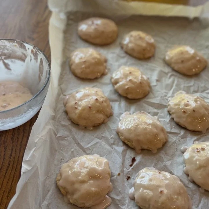 To make the glaze, whisk together powdered sugar, lemon juice, and raspberry jam until smooth. If it’s too thick, add a little more lemon juice; if too thin, add more powdered sugar. Drizzle or dip the cookies in the glaze, then let them sit for about 20 minutes to set.